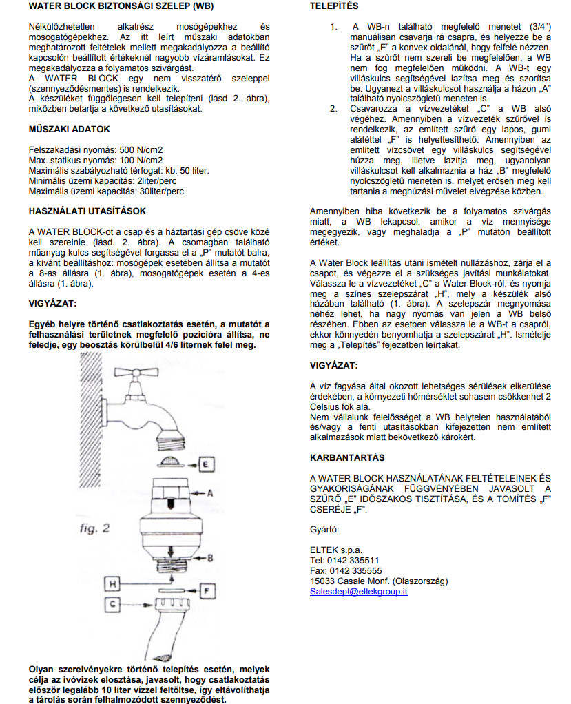 A Water Block szelep egy túlfolyás elleni biztonsági eszköz, amely 5 és 50 liter közötti maximális vízfogyasztást felügyel. Feladata, hogy megmérje az átfolyt víz mennyiségét. Ha ez a mennyiség meghaladja a beállított értéket, a Water Block leállítja az áramlást, és ezt a biztonsági állapotot fenntartja mindaddig, amíg a felhasználó közbe nem lép.